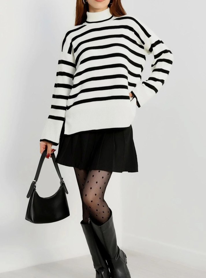 Yuvarlak yaka, uzun kollu ve bol kesim bu kadın kazağı siyah beyaz çizgili desene sahip, yumuşak triko kumaştan üretilmiştir. S,M,L bedenlere uygundur