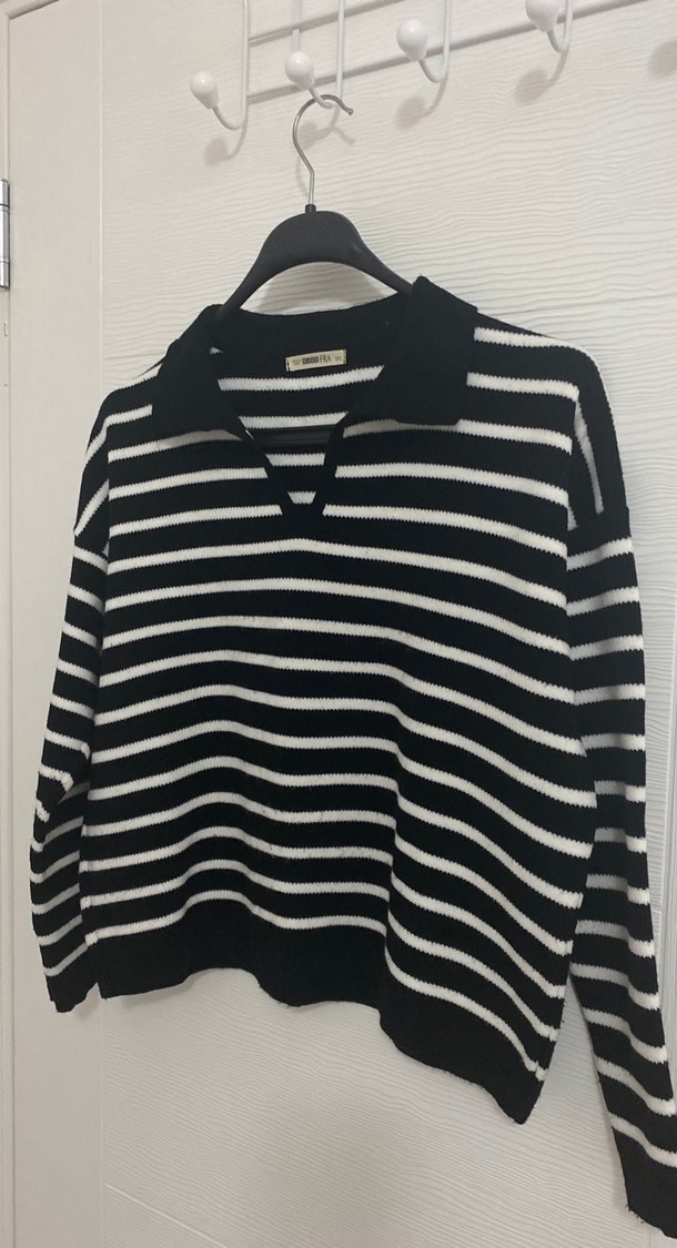 Siyah beyaz çizgili, yakalı ve uzun kollu örme triko kazak. Rahat kesim ve normal boyda, sentetik kumaştan üretilmiş günlük sokak tarzı için uygun. Sayılı giyildi. Tertemiz hiçbir sorunu yoktur
