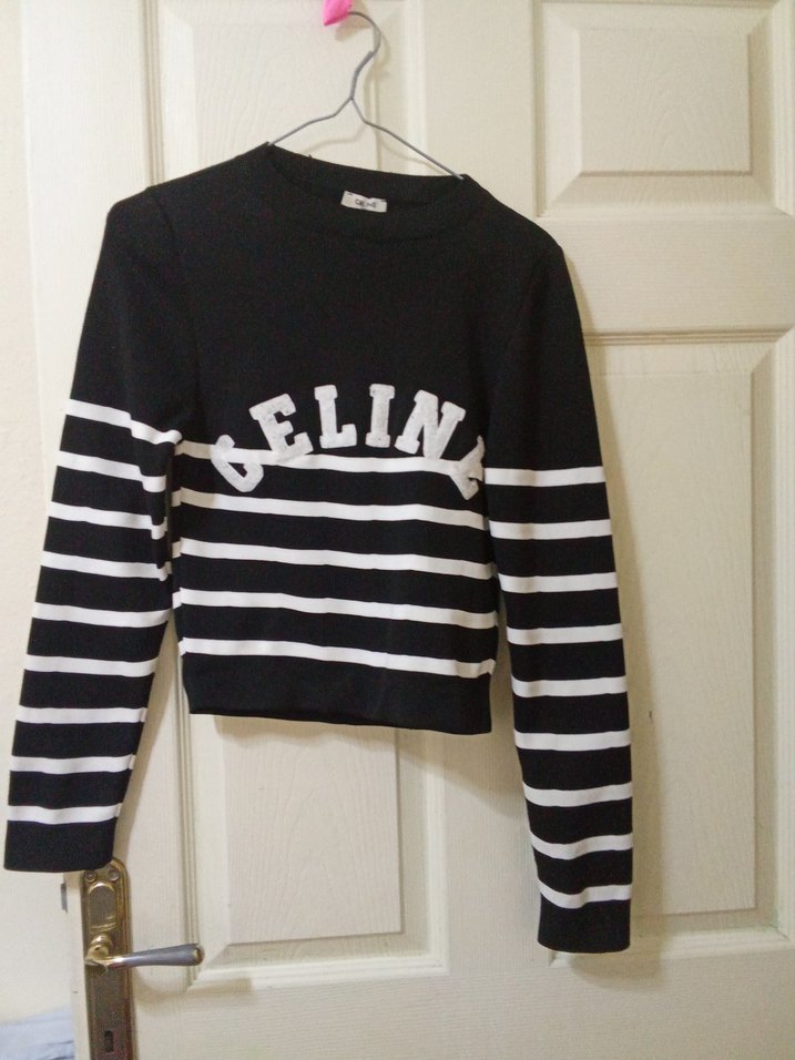 süper fiyat CELİNE Siyah ve beyaz çizgili, ince triko kumaştan, bisiklet yaka ve uzun kollu, dar kesim kadın kazak. Günlük kullanıma uygun Paris sokak stili.