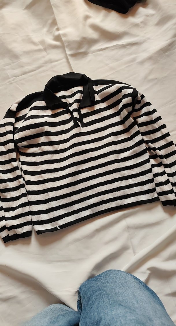 Bol kesim, uzun kollu, yakalı ve çizgili desenli kadın triko sweatshirt. Sentetik örme kumaştan, günlük kullanıma uygun.