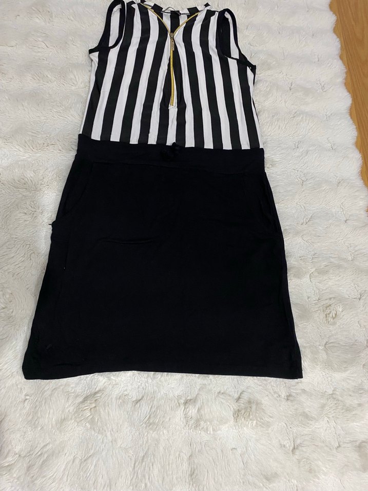 V yaka ve fermuarlı, kolsuz uzun elbise. Üst kısmı siyah beyaz çizgili, alt kısmı düz siyah. Sentetik kumaştan, regular fit ve günlük sokak stili için uygun.