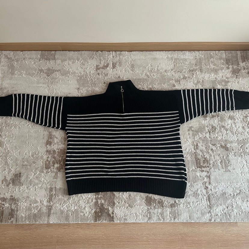 Siyah Beyaz Çizgili Kadın yakası fermuarli oversize Kazak
