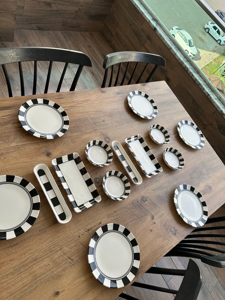 Çeşitli boylarda tabak ve tepsilerden oluşan siyah beyaz çizgili yemek takımıdır. ️