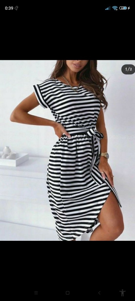 Siyah beyaz çizgili, kemerli ve tekne yaka kısa elbise. İnce askılı, sentetik kumaştan, günlük rahat sokak tarzı için uygundur. kemeri yokk