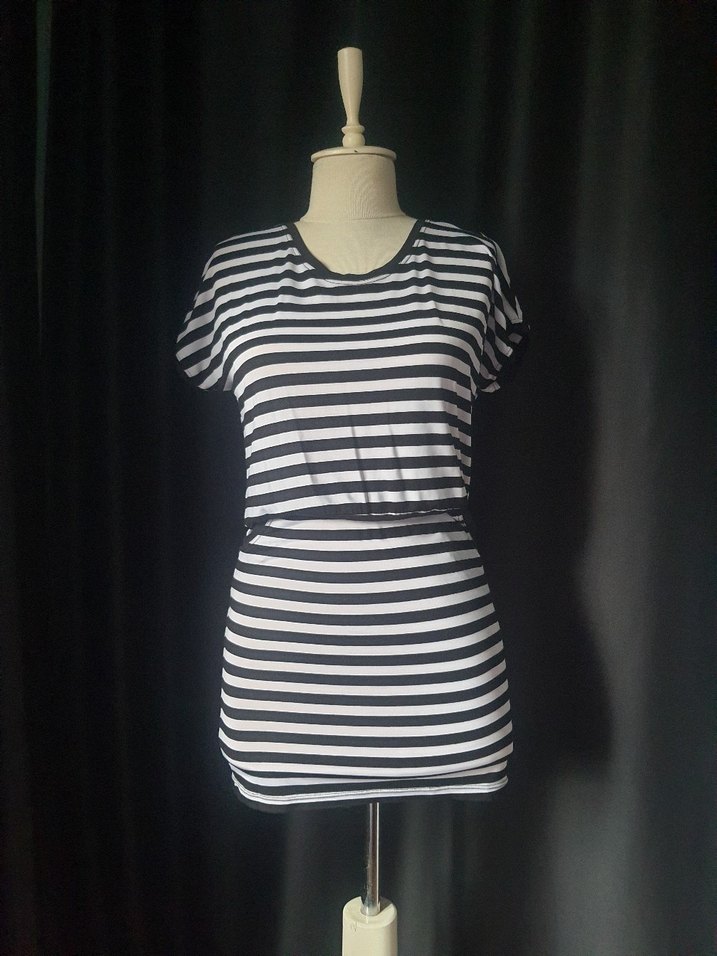 Siyah Beyaz Çizgili Kısa Kollu Mini Elbise