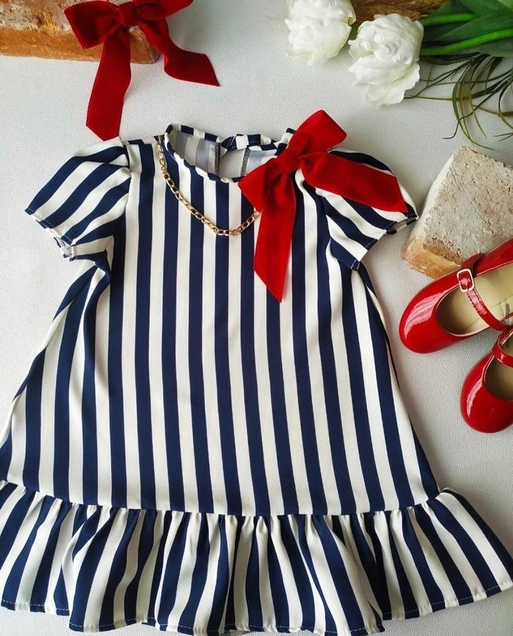 Siyah beyaz çizgili, rahat kesim kız elbisesi, fırfırlı etek ucu ve omuzda kırmızı fiyonk detayıyla. Sentetik kumaştan, halter yaka tarzında.