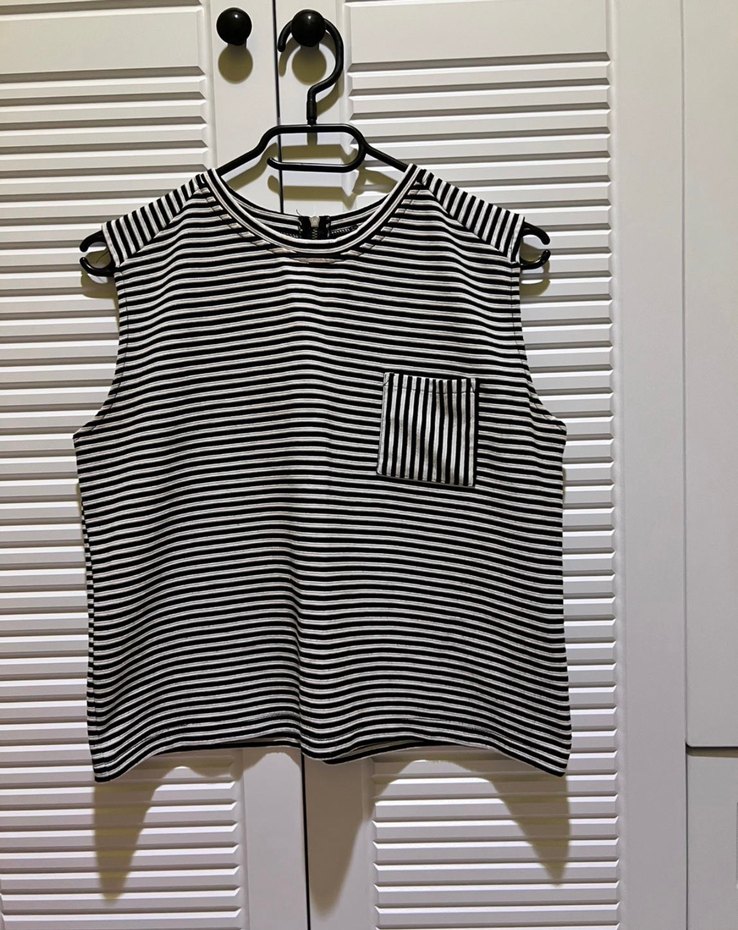 Tekstilden üretilmiş, kolsuz, tek cep detaylı, çizgili ve bol kesim crop top. Günlük sokak stiline uygun rahat bir tasarım.