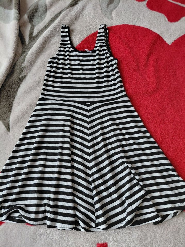 L/M beden ,Kolsuz, siyah beyaz çizgili, pileli midi elbise, günlük sokak tarzı için uygundur.