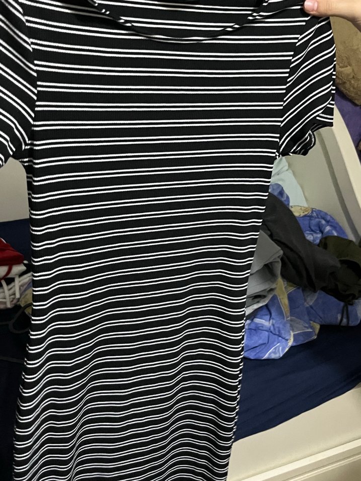 Kısa kollu, tekne yaka ve pileli detaylı, siyah beyaz çizgili, vücuda oturan midi elbisedir.