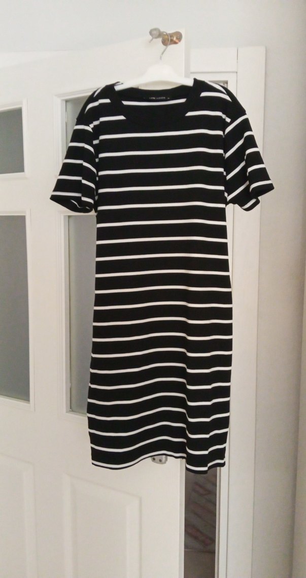 Siyah beyaz çizgili, kısa kollu midi elbise. Pamuklu, rahat kesimli ve yuvarlak yakalı, günlük kullanıma uygun minimalist tarzda.