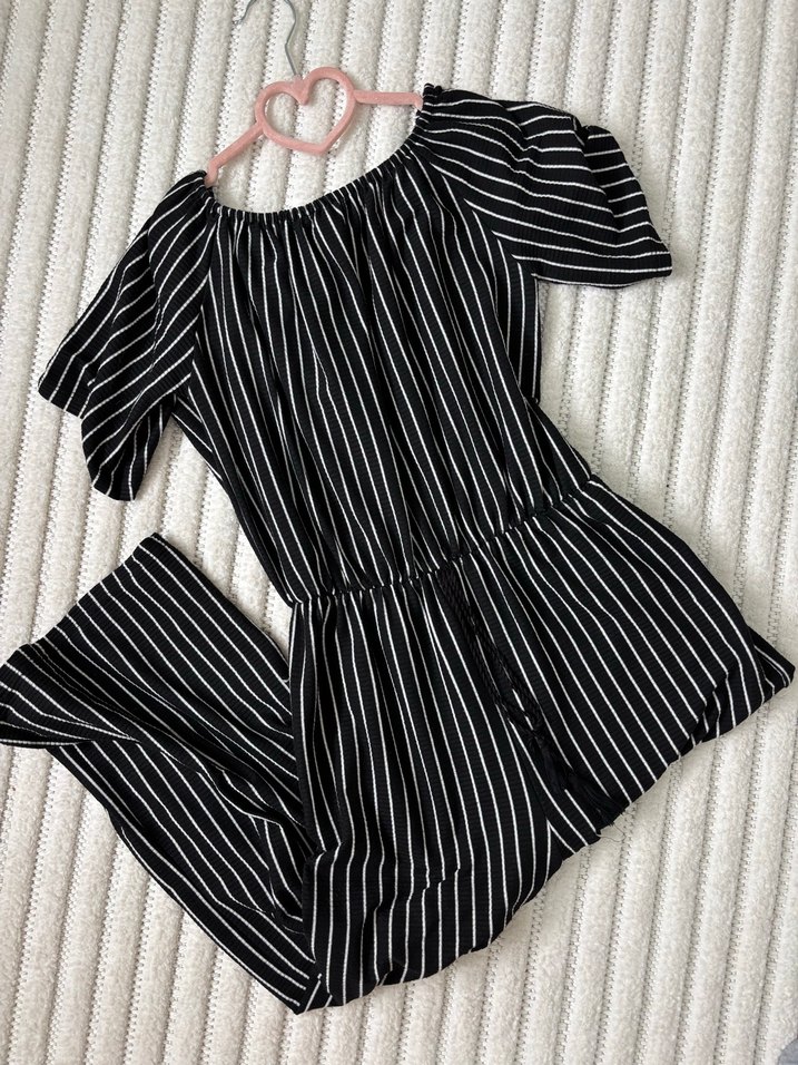 Bu siyah tulum, bol kesim, kısa kollu ve kayık yaka detaylarına sahiptir. Çizgili ve pileli tasarımıyla günlük sokak stiline uygundur.