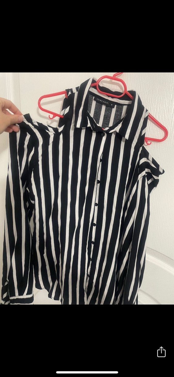 Siyah beyaz çizgili, omuz detaylı, düğmeli önü ve uzun kollu, salaş kesim gömlek. Straplez yaka ile günlük rahat stil sunar.