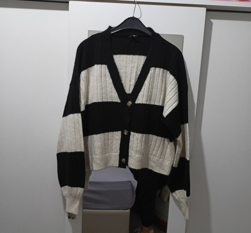 Siyah beyaz çizgili uzun kollu bol kesim yumuşacık kalın kışlık hırka. Bir sorunu yoktur. Son fiyat.
