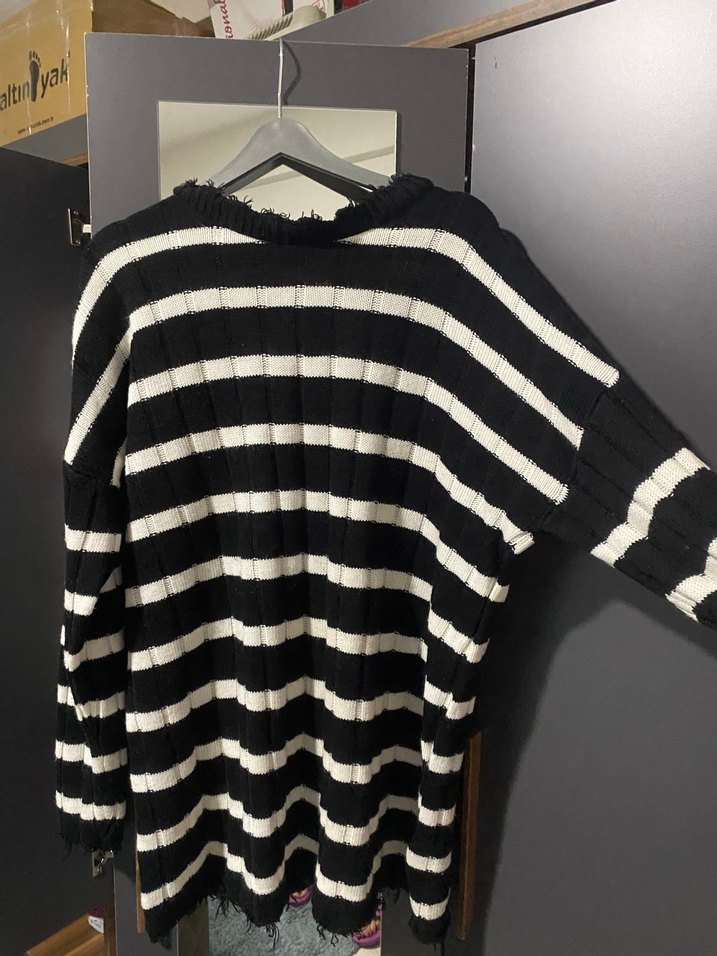 Siyah beyaz çizgili, uzun kollu, gevşek kesim örgü elbise. Tekneden yakalı ve midi boy, günlük kullanım için uygun.