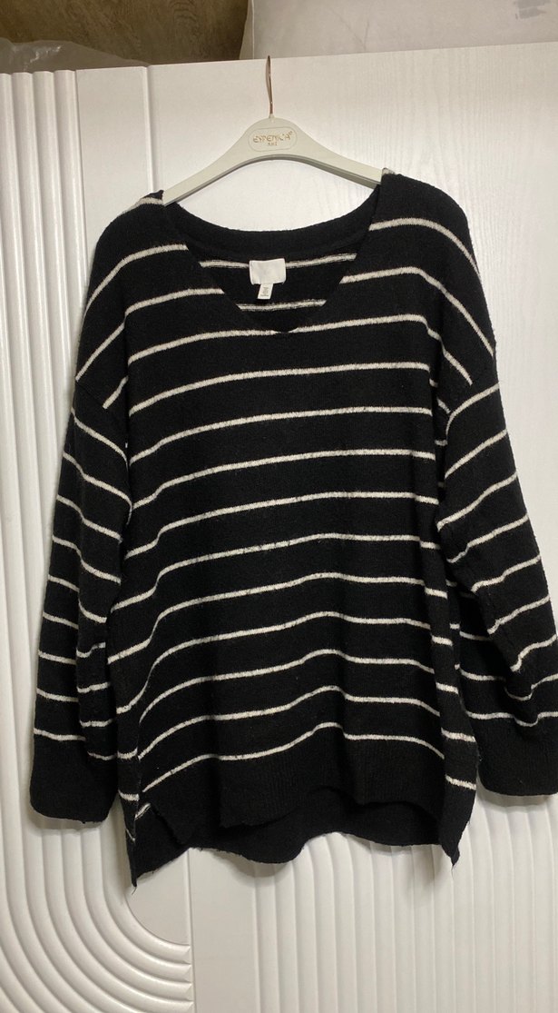 Uzun kollu, kayık yaka, örgü yünden yapılmış, siyah beyaz çizgili ve bol kesim kadın kazak. Rahat ve günlük kullanıma uygun, sokak modasına uygun.