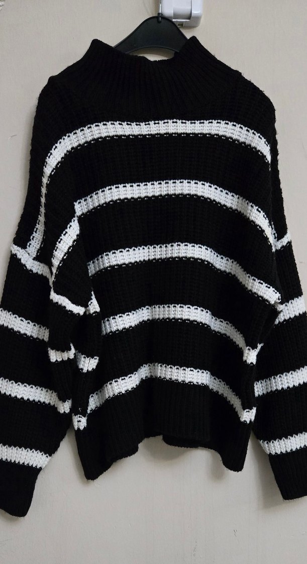 Siyah renkte, beyaz yatay çizgili örme kazak. Kayık yaka ve uzun kollu, bol kesim ve normal boyda, rahat sokak stili için uygun.