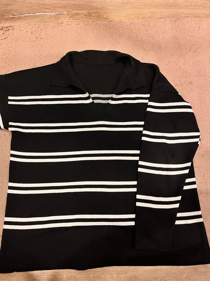 Siyah beyaz çizgili, yakalı ve uzun kollu örgü kadın kazak. Rahat kesimi ve yumuşak, sıcak kumaşı ile günlük sokak stiline uygundur. Butikten alınmış ve herhangi bir kusuru yoktur