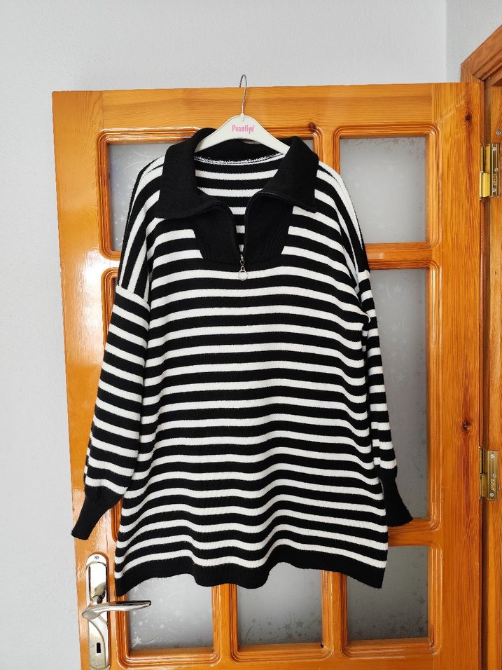 Siyah beyaz çizgili, uzun kollu, yakalı ve fermuarlı önden örgü kadın kazak. Rahat kesimi ve midi boyu ile günlük kullanıma uygun sokak stili kazak.