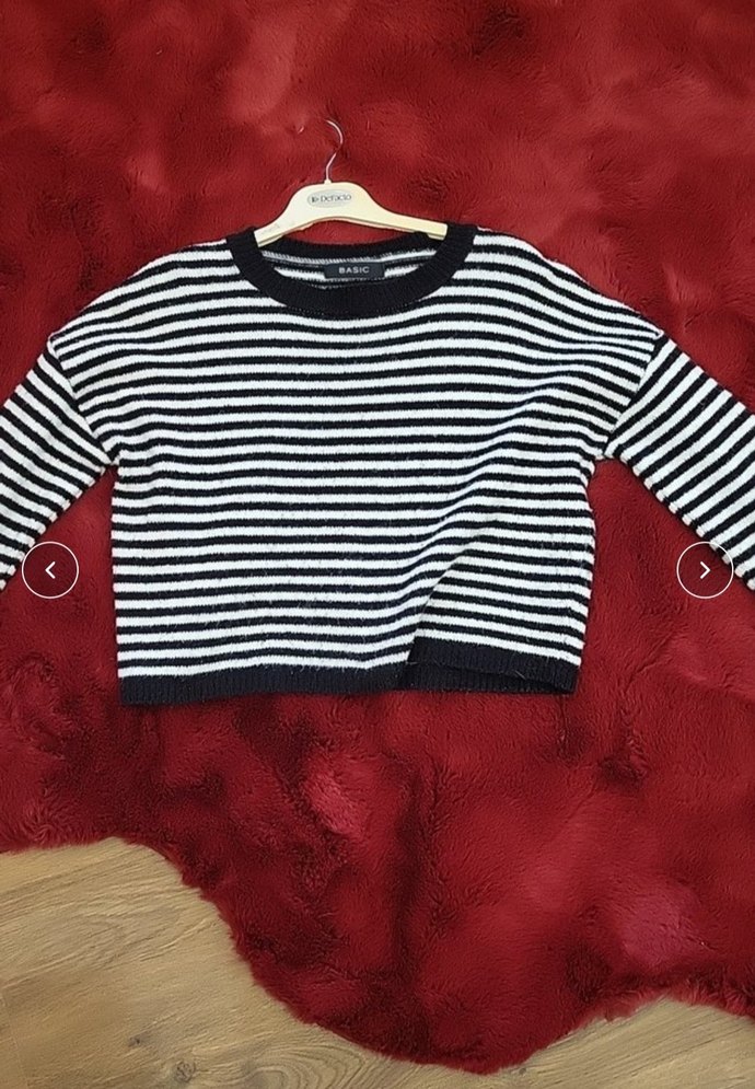 Siyah beyaz çizgili, uzun kollu, yuvarlak yakalı ve bol kesim örgü kazak. Kısa boyda, rahat ve günlük kullanıma uygun.