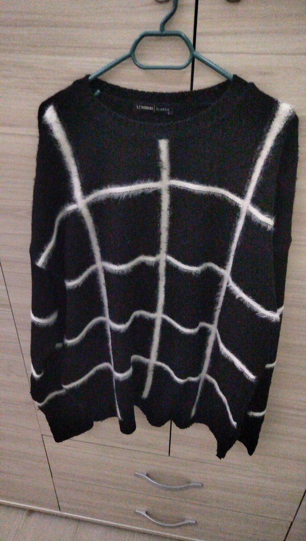 Bu siyah örgü yün kazak, uzun kollu ve yuvarlak yakalıdır. Beyaz çizgilerle desenlendirilmiş, rahat goth tarzında, bol kesim ve normal boydadır.