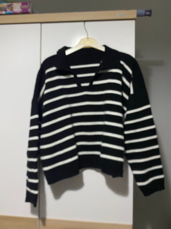 Siyah beyaz çizgili, uzun kollu, yakalı ve örgü kadın kazak. Yün malzemeden, rahat ve günlük kullanıma uygun.