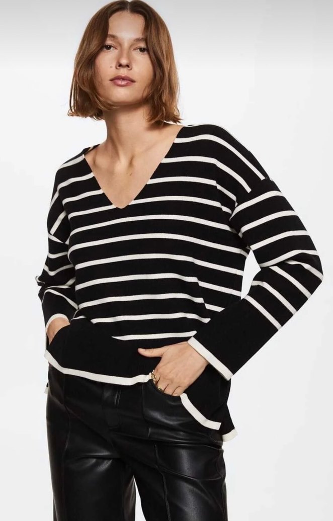 Uzun kollu, V yaka ve bol kesim kadın kazak. Pamuklu, örgü dokulu, siyah beyaz çizgili, günlük rahat kullanıma uygun.
