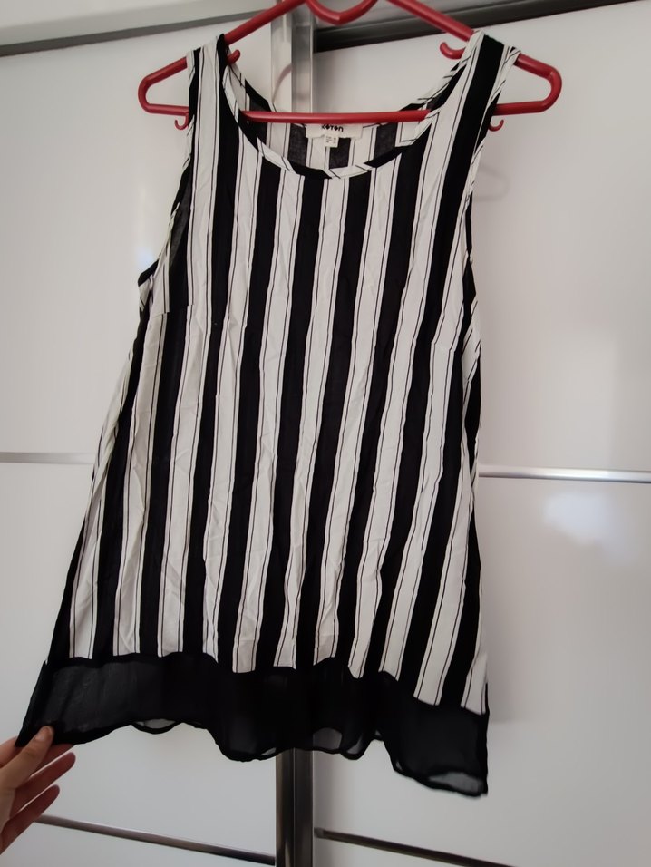 Dikey siyah beyaz çizgili, pilili, kolsuz ve straplez kesime sahip bol kesim bluz. Yumuşak sentetik kumaştan, günlük kullanım için uygundur.