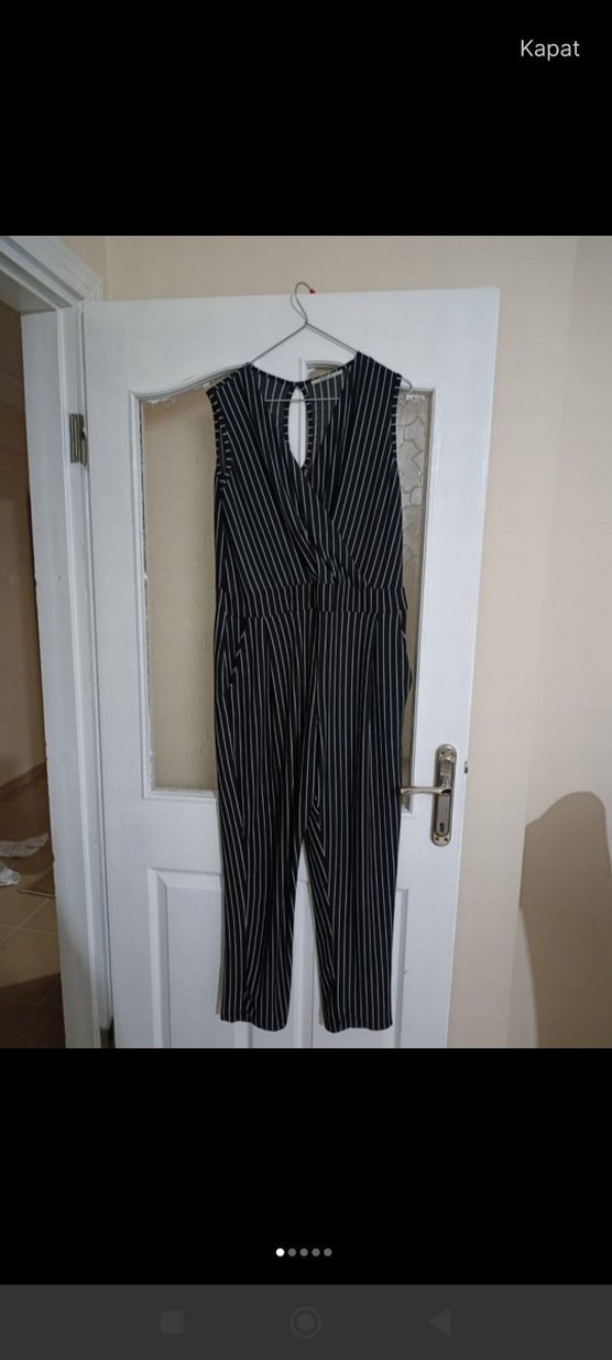 siyah beyaz renkli, kolsuz, piliseli ve çizgili tasarıma sahip, sentetik kumaştan yapılmış kadın tulum. Notlu yaka ve normal kesim özellikleriyle ofis için uygun. 42 beden ama 44 46 bedene uygun