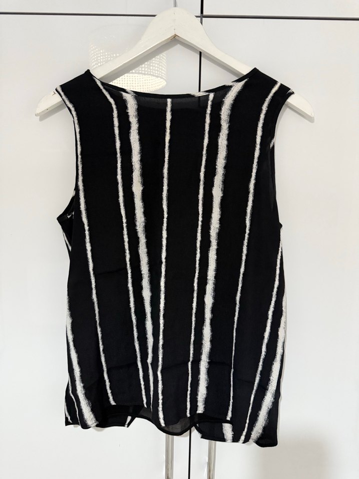 Siyah kolsuz bluz, beyaz dikey tie-dye çizgiler ve piliseli detaylara sahiptir. V yakalı ve bol kesimdir, sentetik kumaştan üretilmiştir, günlük kullanım için uygundur.