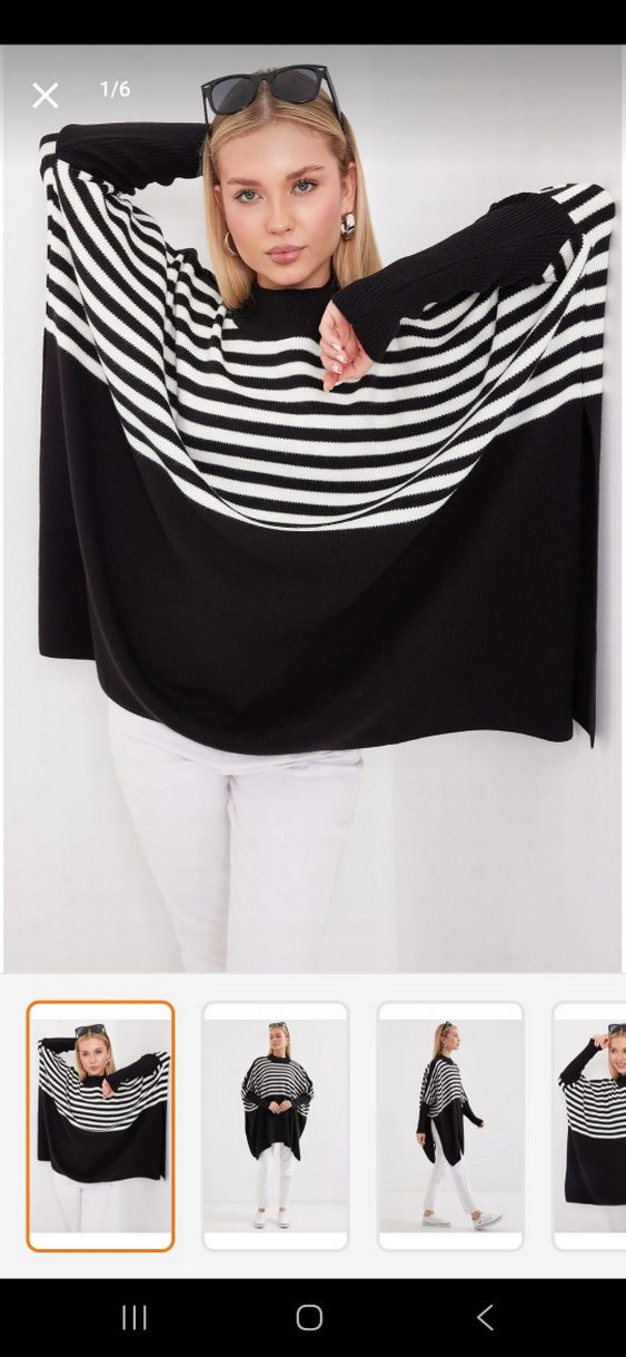 Siyah beyaz çizgili, uzun kollu ve yuvarlak yakalı salaş kesim kadın kazak. Salaş ve dökümlü tasarımıyla günlük kullanıma uygun rahat bir sokak stili kazak. Sentetik kumaştan üretilmiştir.