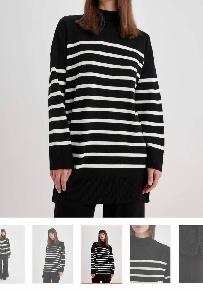 Siyah beyaz çizgili, salaş kesim ve uzun kollu kadın kazak. Yumuşak triko dokusu ve bisiklet yaka detayıyla günlük kullanıma uygundur. Defactodan alındı pamukludur. Etiketlidir.