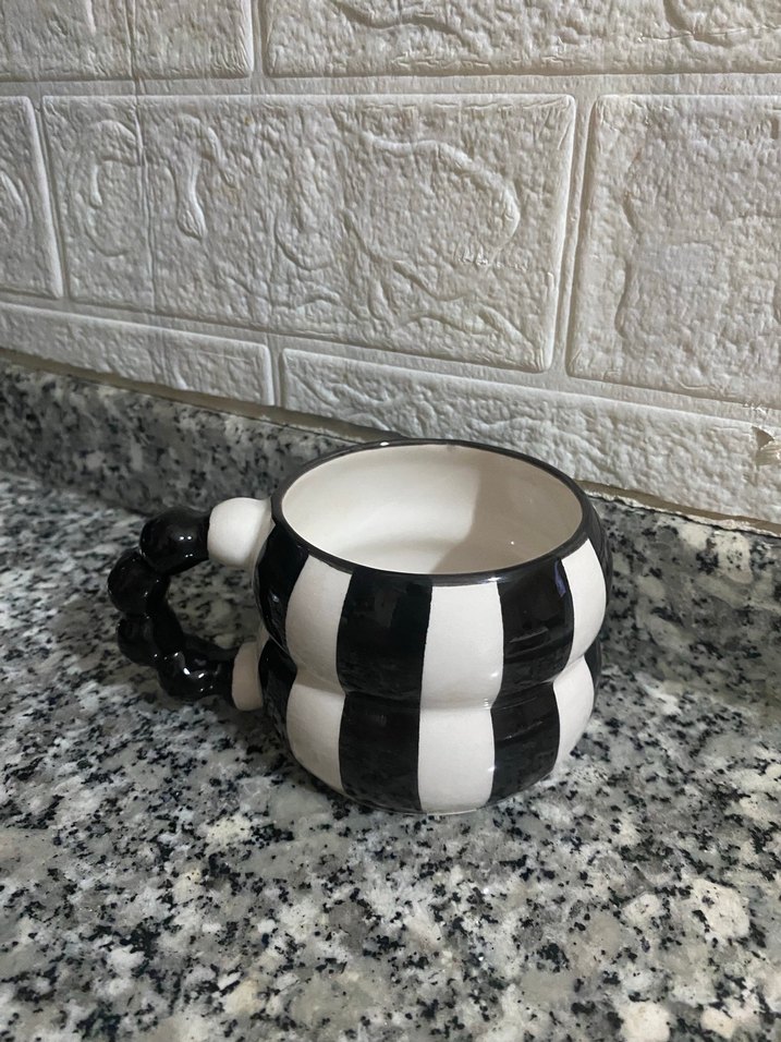 Siyah beyaz çizgili, özel tasarımlı kulplu el yapımı seramik kupa, sıcak içecekler için uygundur. ☕