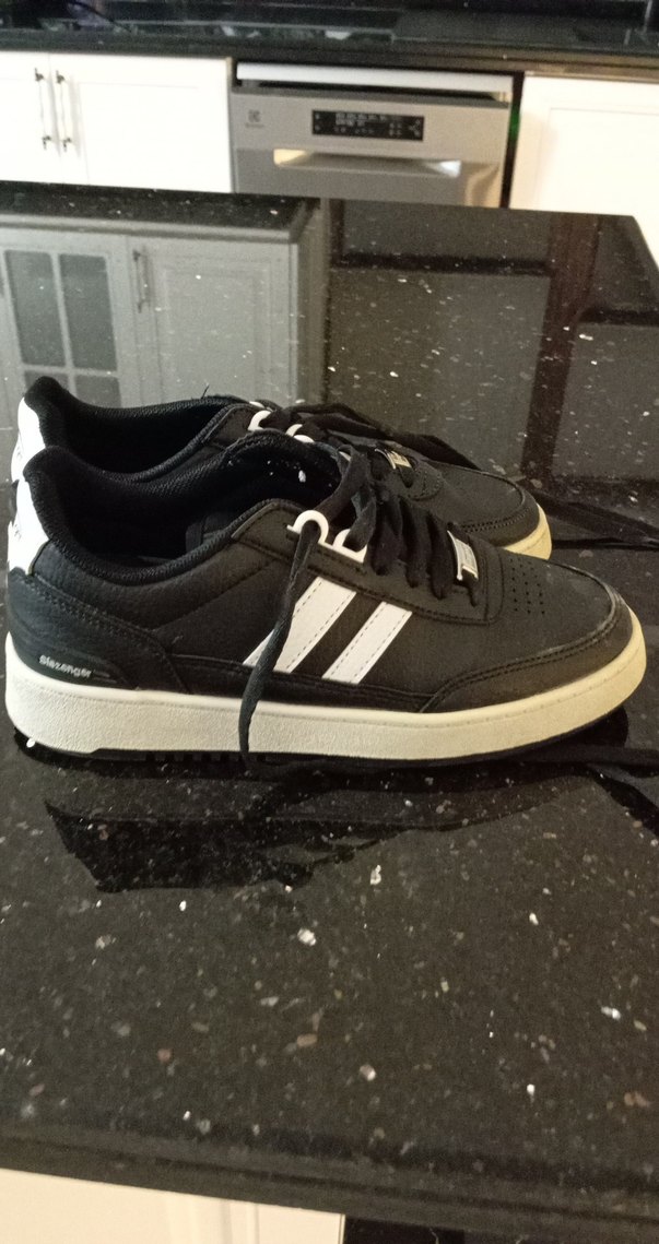 Siyah beyaz çizgili detaylı, lastik tabanlı kadın spor ayakkabısı. Cırt cırtlı ve ince topuklu, spor ve günlük kullanıma uygun.