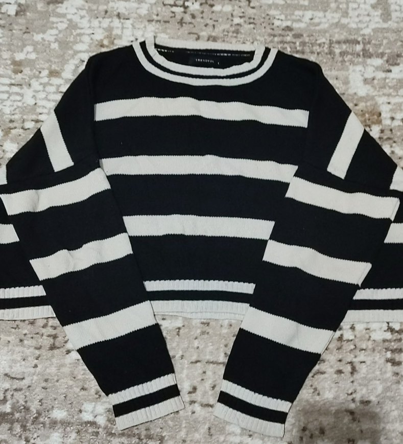 Uzun kollu, yuvarlak yakalı, siyah beyaz çizgili triko kadın kazak. Salaş kesimi ile rahat kullanım sunar.Hafif croptur.