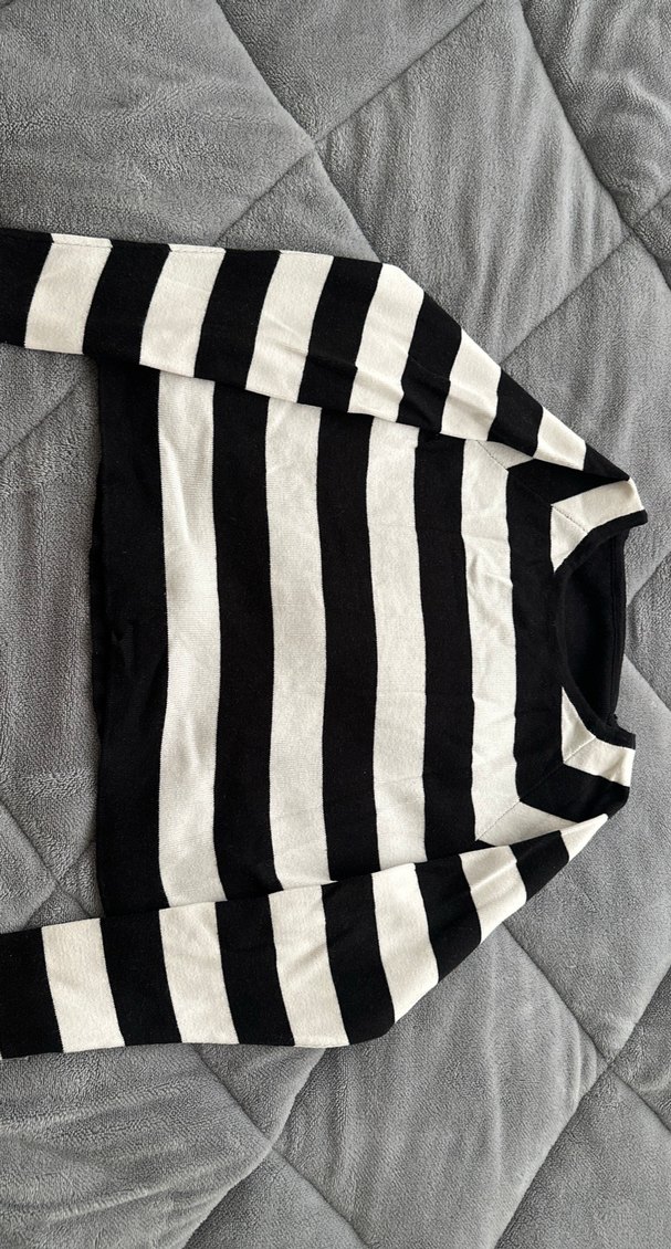 Siyah beyaz yatay çizgili, uzun kollu, tekne yaka ve vücuda oturan triko kadın kazak. Yumuşak sentetik örgü kumaştan, günlük sokak stiline uygun.