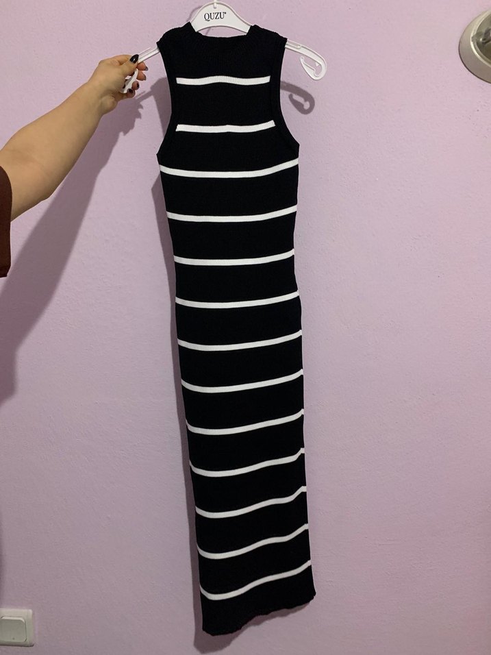 Siyah ve beyaz çizgili uzun, ince ve elastik detaylı bu elbise yüksek yakalı ve askılı tasarıma sahiptir. Günlük kullanıma uygun, Paris sokak modası tarzında.