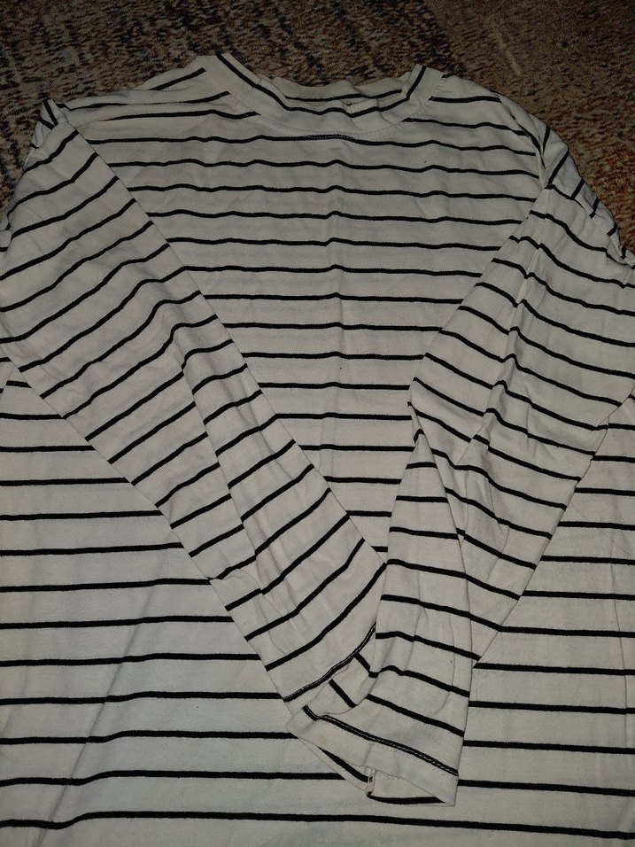 Siyah Beyaz çizgili, uzun kollu, kayık yaka ve pile detaylı uzun kollu. Sentetik kumaştan, bol kesim ve günlük sokak tarzına uygun.