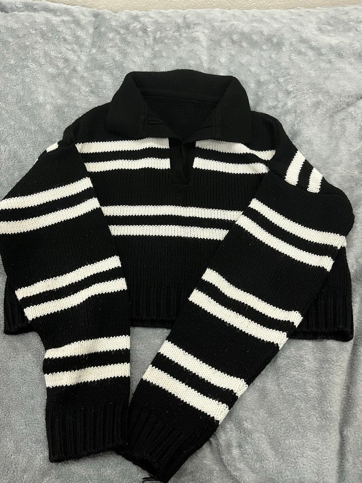 Bu fitted siyah kazak, beyaz yatay çizgiler ve yakalı tasarımıyla yumuşak örgüden yapılmıştır, rahat goth tarzı sunar.