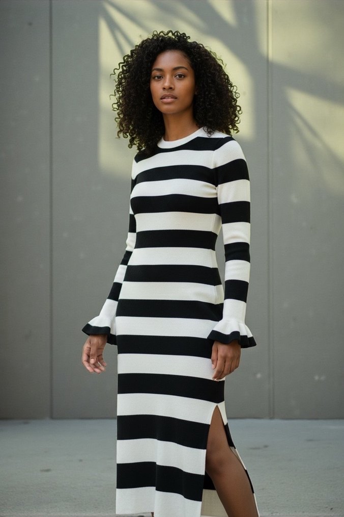 Siyah Beyaz Çizgili Uzun Kollu Triko Elbise