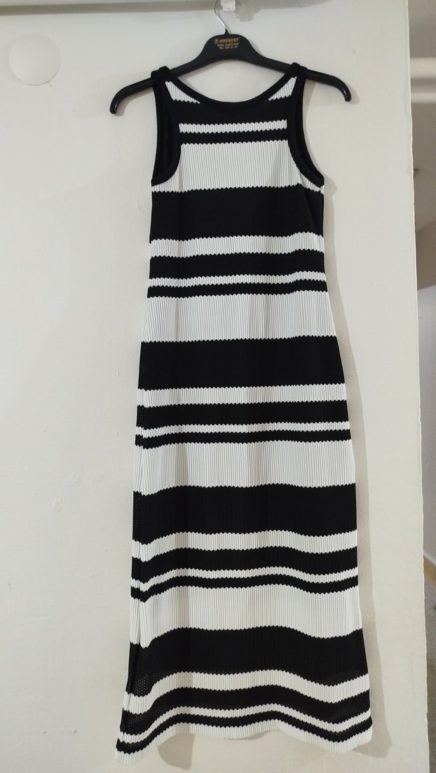Siyah beyaz çizgili, piliseli dokulu, uzun ve kolsuz elbise. Yaka tipi kayık, sentetik yumuşak kumaştan, günlük sokak stili için uygun. astarı vardr