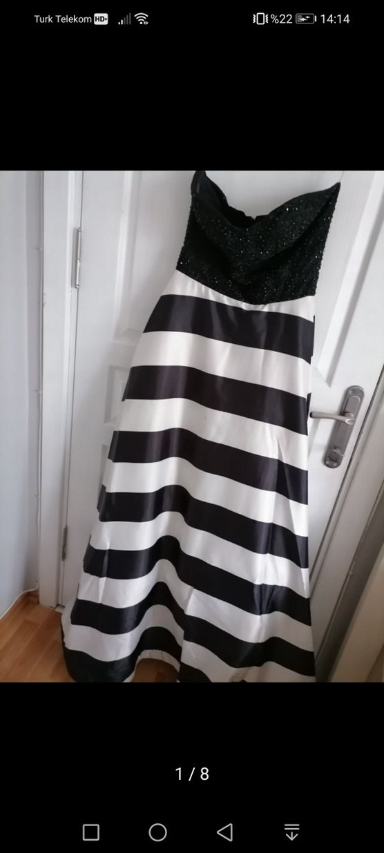 Uzun, fitted kesim elbise, straplez siyah üst kısmı ile siyah-beyaz geniş çizgili etek kısmına sahiptir. Parti için goth tarzı uygundur. Temiz değil kuru temizlemeye gitmesi gerek. 1 kere giyildi. İçinde Tarlatan tülü vardır