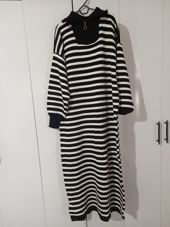 Siyah beyaz çizgili bu uzun triko elbise, bol kesim, uzun kollu. Yumuşak sentetik kumaştan üretilmiştir. Boyu 130 cm iki kol arası genişlik 55 cm.