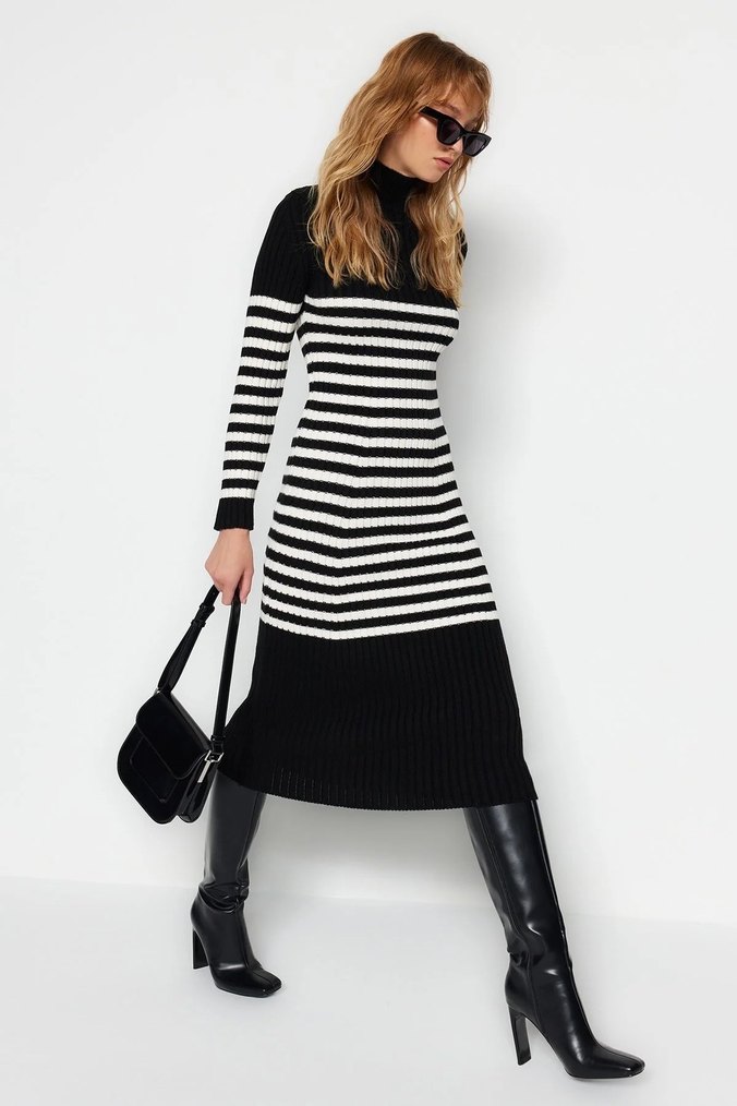 Siyah Beyaz Çizgili Uzun Triko Elbise