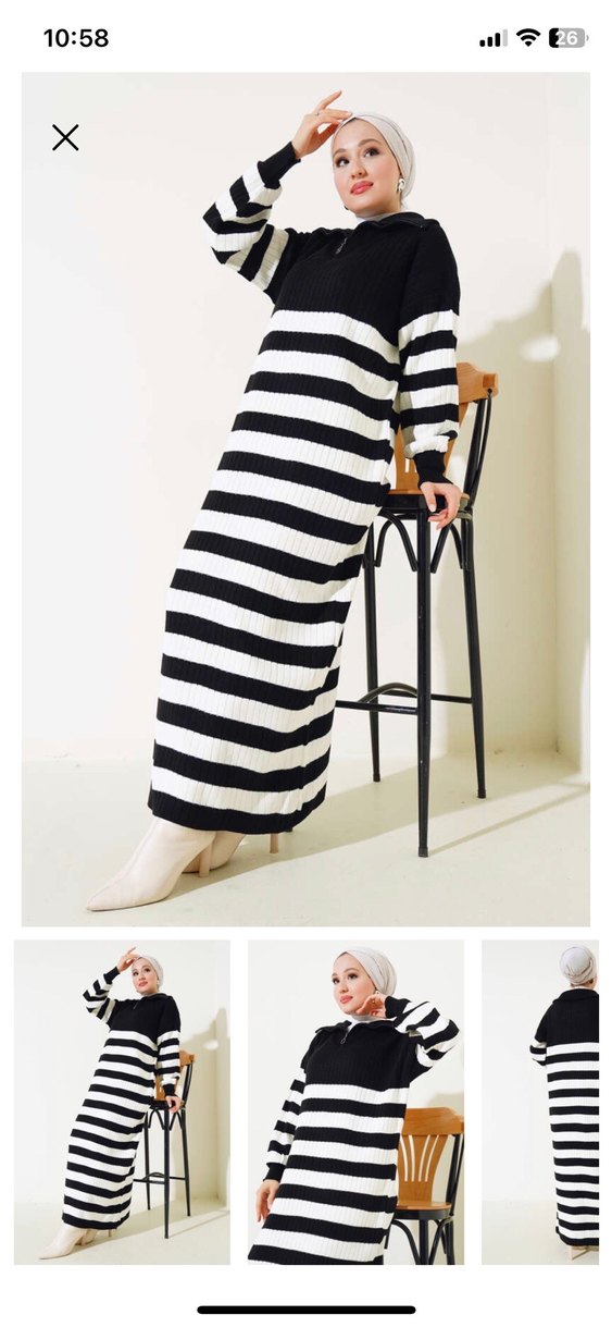 Kadınlar için uzun, bol kesim, yüksek yakalı ve uzun kollu triko elbise. Siyah beyaz zebra çizgili, sentetik dokuma kumaştan yapılmıştır.
