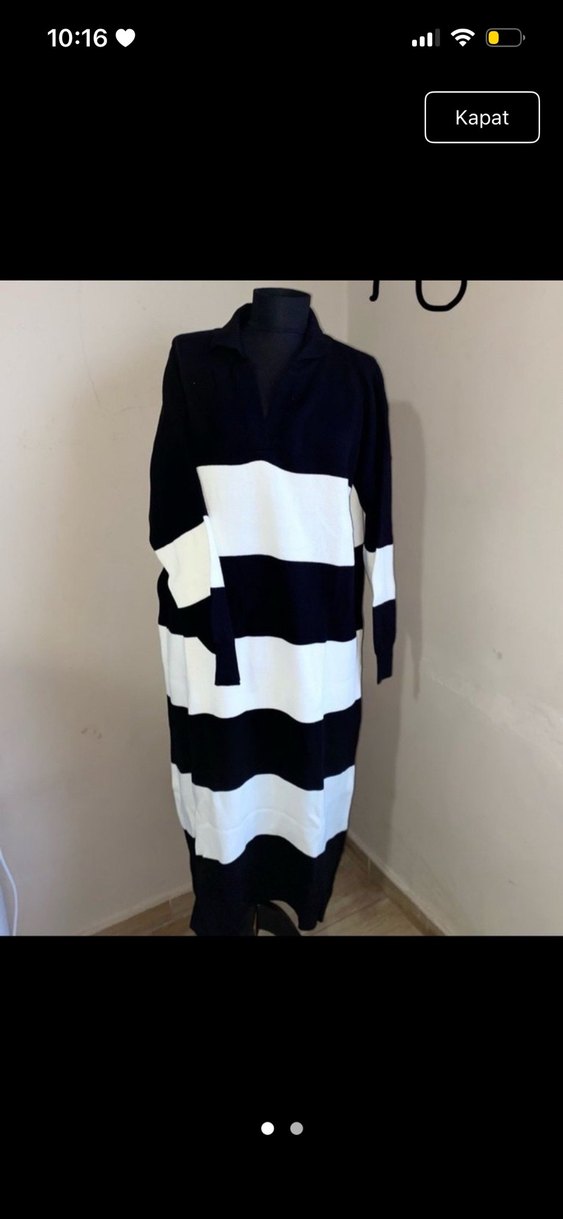 Uzun kollu, tekne yaka, siyah beyaz çizgili triko elbise. Rahat sentetik kumaş ve regular fit ile günlük sokak modasına uygun.