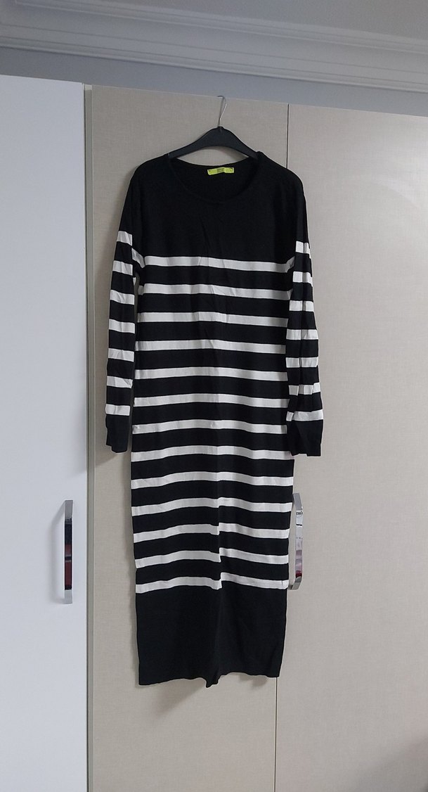 Siyah ve beyaz çizgili, uzun ve vücuda oturan triko elbise. Yuvarlak yaka ve uzun kollu, yumuşak sentetik kumaştan günlük sokak stiline uygun.