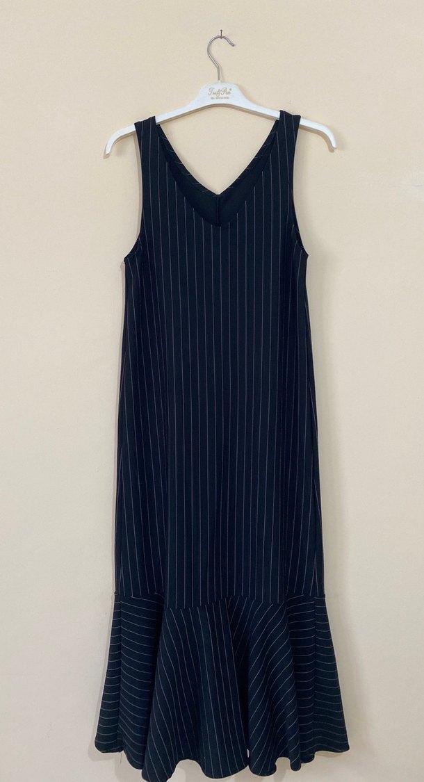 Lacivert renkte, V yakalı, kolsuz midi elbise. Çizgili ve pileli detaylara sahip, rahat kesimli gündelik kullanıma uygun bir model.
