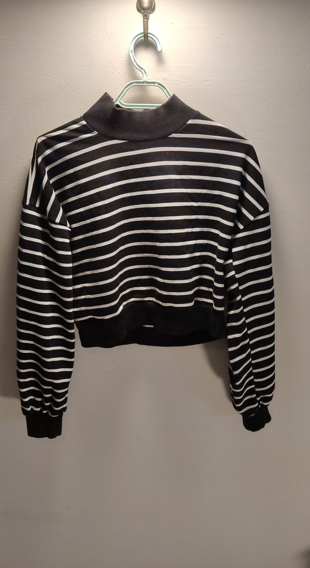 Uzun kollu, yüksek yakalı siyah beyaz çizgili kadın kazak. Sentetik kumaştan örme, bol kesim ve günlük kullanıma uygun tarzda.