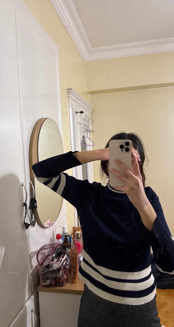 Siyah Beyaz Çizgili Yüksek Yakalı Triko Kazak