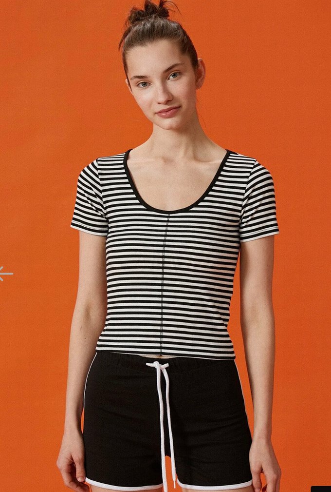 yuvarlak yaka ve kısa kollu, siyah beyaz çizgili, vücuda oturan kadın tişörtü. Yumuşak sentetik kumaştan, günlük şıklık sağlar.